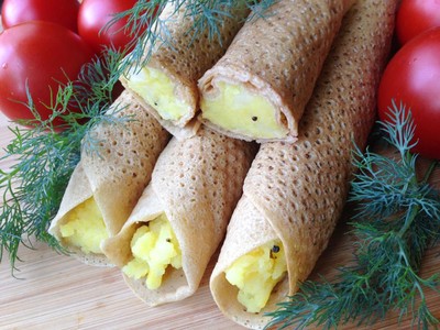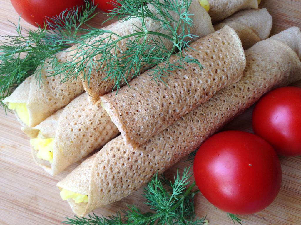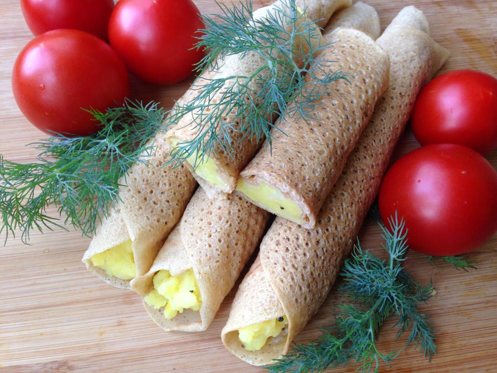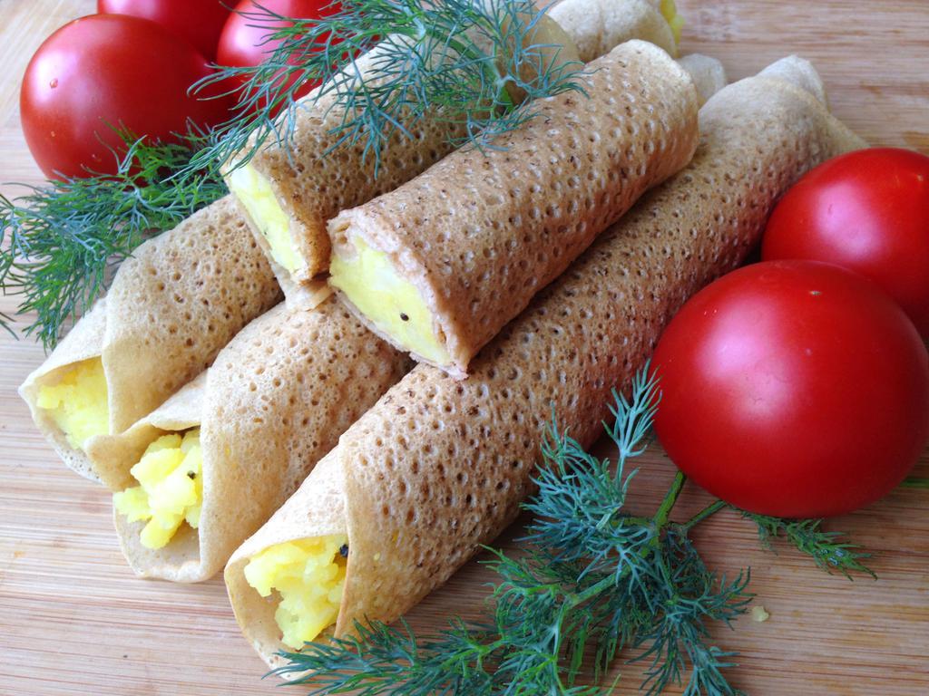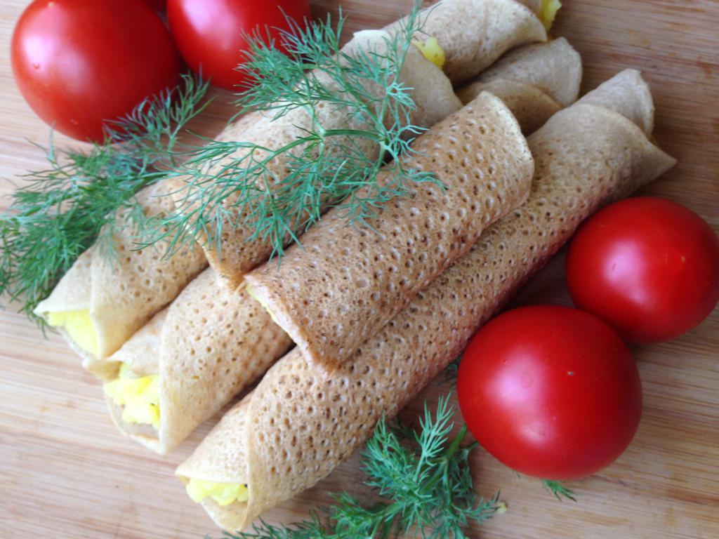 - берем ложку начинки и заворачиваем ее в блинчик;