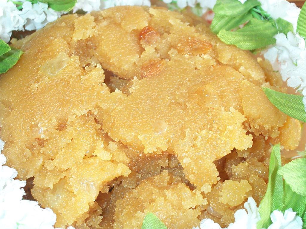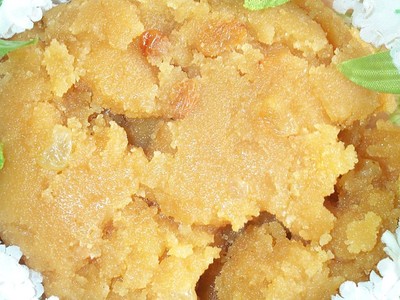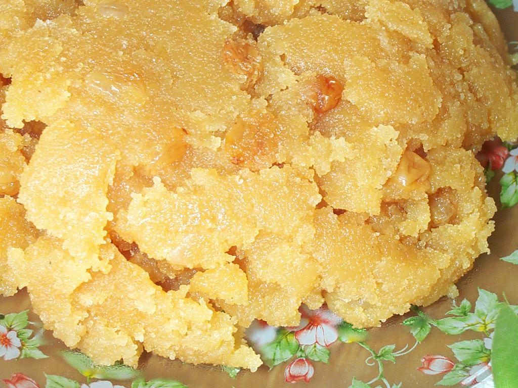 - когда манка станет бежевой, добавить по желанию фрукты (апельсины, бананы и т.д.) и/или орехи (арахис) и залить ее нашим сиропом, но очень аккуратно!, манка будет шипеть и брызгаться;